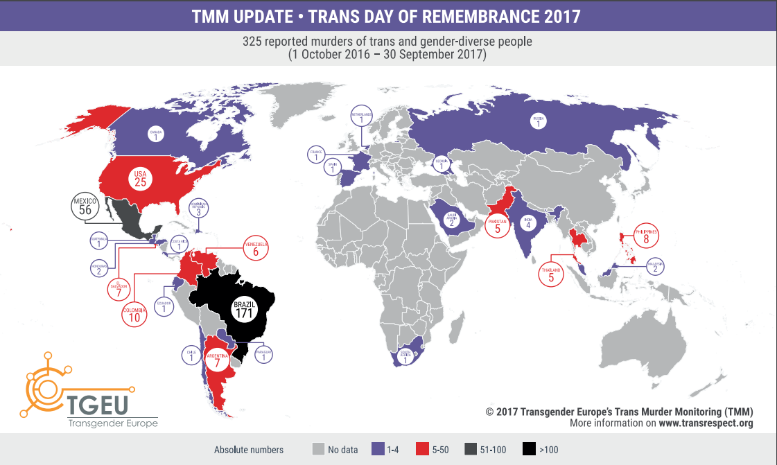 Com o projeto Trans Murder Monitoring (Monitoramento de assassinatos de pessoas trans), a ONG TransRespect monitora, coleta e analisa assassinatos de LGBTs reportados na internet. Uma atualização anual do levantamento é publicada sempre nas proximidades do Trans Day of Remembrance (Dia de Memória dos Transgêneros), celebrado em 20 de novembro. A data foi instituída em 1999, nos Estados Unidos, para lembrar transexuais e travestis assassinados.